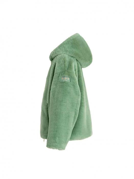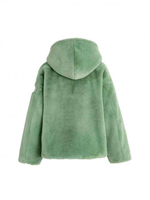 艶やかなラビットファー調エコファーを使用して、ラグジュアリーな表情に仕上げたフード付きブルゾン。