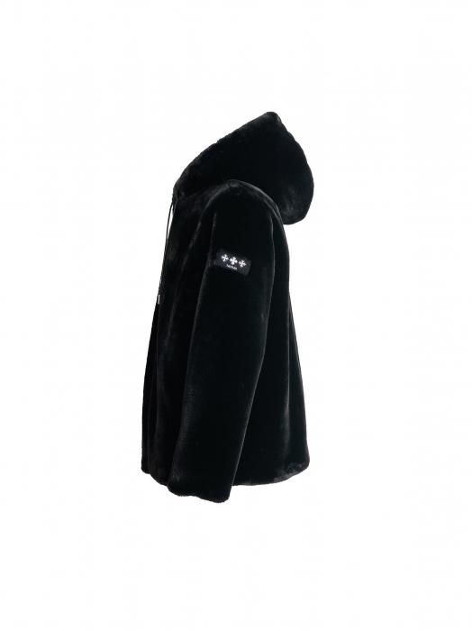 美しい艶感を持つ、エコファー素材を採用したフード付きブルゾン。